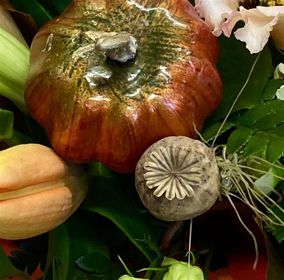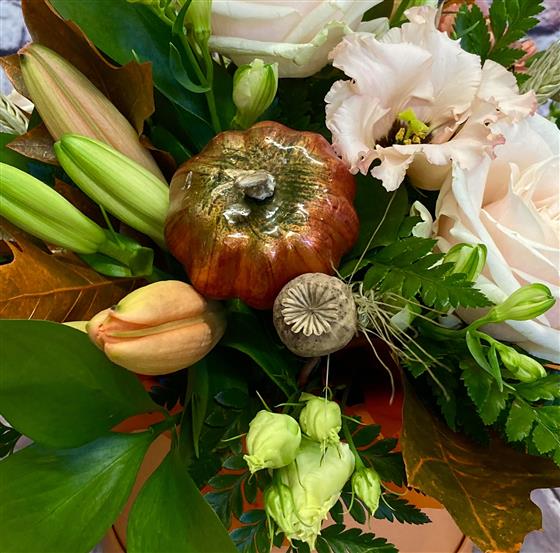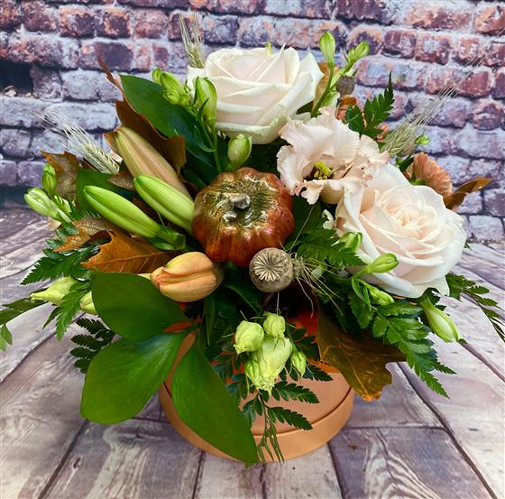 A hat box design of autumnal flowers and foliage’s. Pale peach roses.