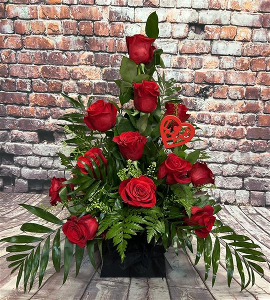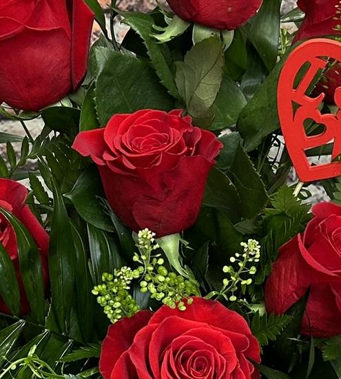 An arrangement in Oasis of 12 red roses with seasonal foliage’s. Valentines pick.