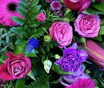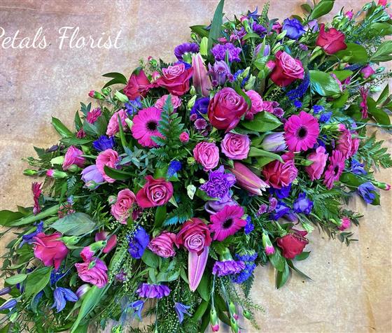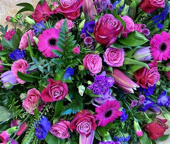 A bright casket top of cerise and purple flowers.Seasonal foliage’s. Roses bright Germini in vivid pink. Purple Lizzi and carnations.