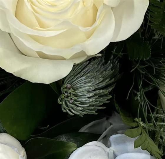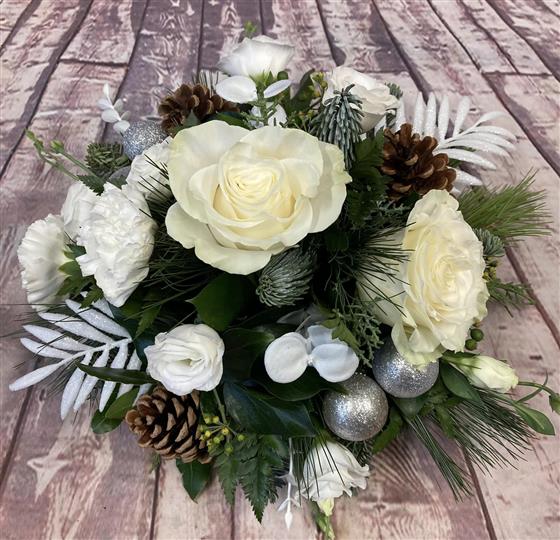 A Christmas posy all in white. Seasonal foliages of pine. White flowers of florist choice.