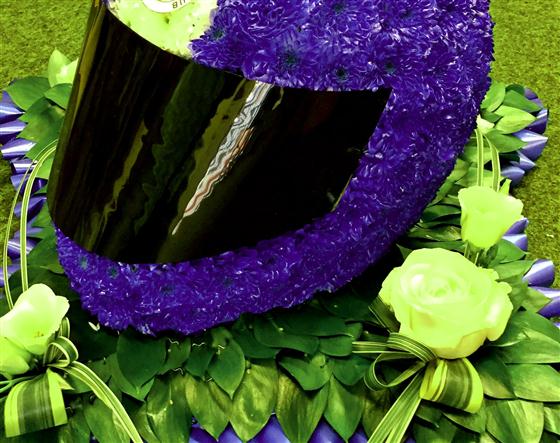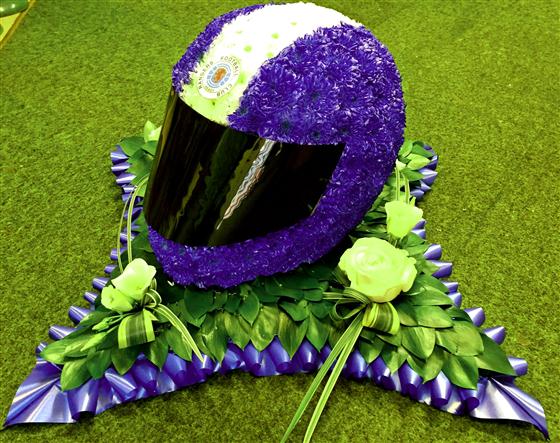 A motor bike helmet tribute made from Chrysanth and matching sprays to compliment tribute. Local delivery only or collection from shop.