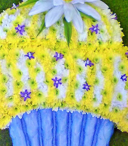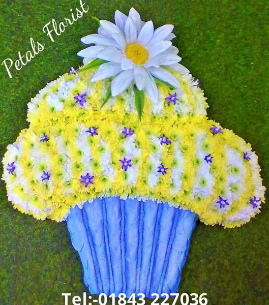 A cupcake tribute made of Chrysanth with a leaf bottom,tiny hyacinth pips decorate the top of the cupcake finished off with a hand made Daisy.