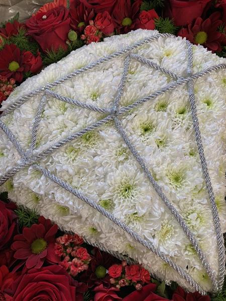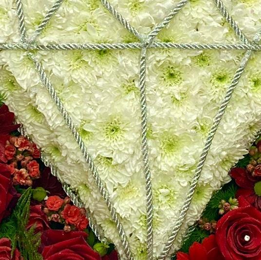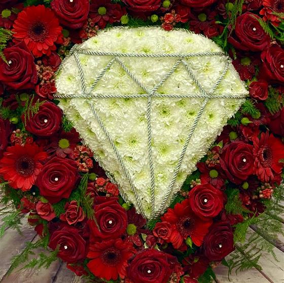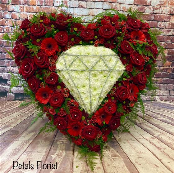 A 21” heart with a diamond design in the centre. Red roses and other seasonal red flowers and foliage are the background.This tribute is also on a stand.