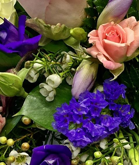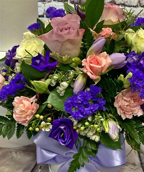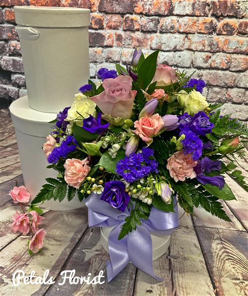 A white hat box with delicate shades of lilac and pink Roses with small sprigs of purple static. Seasonal foliage’s. Two sizes available.