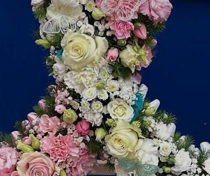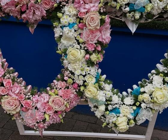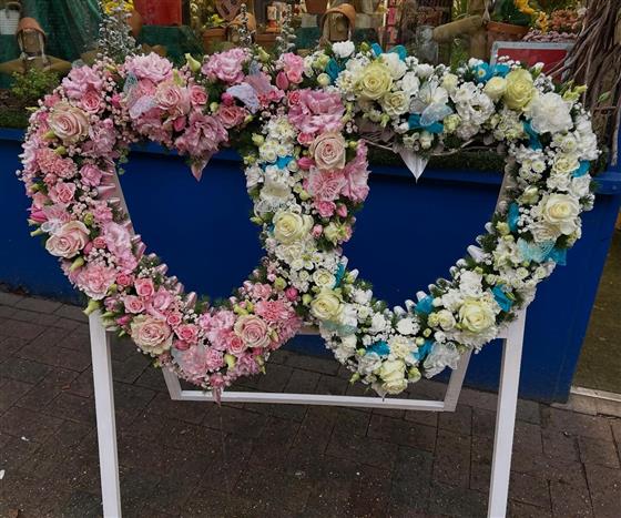 A double interlocking hearts, 3ft across, standing aprox 1m tall on stand. Hand made stand and wood backed. Loose flowers in pink and white. Can be made in different colours.