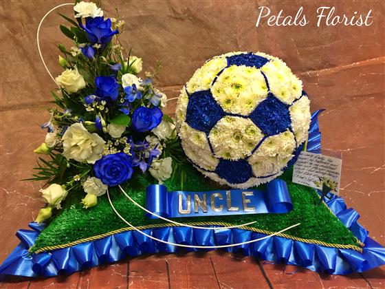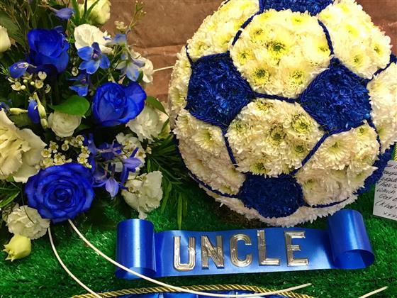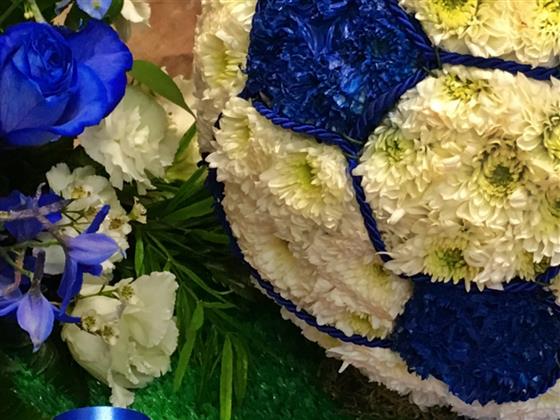 A football tribute made from Chrysanth and a matching arrangement in coulours to suit football teams