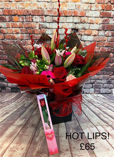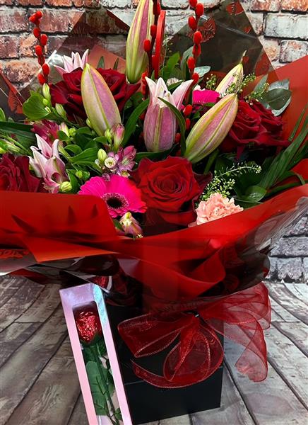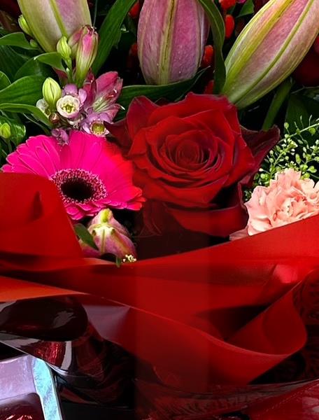 A beautiful aqua packed bouquet of red roses ,lily’s, pink Germini and seasonal foliages. Chocolate rose included with this order.