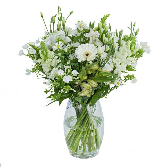 A Handtied bouquet consisting of White Phlox, White Eustoma, Antirrinhum, Alstromeria, Mini Gerbera, White Blooms Chrysanthemums, Aster and Assorted Foliage.