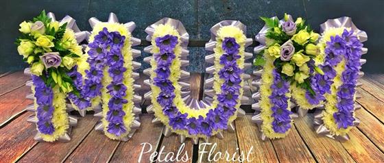 Mum frame with inset colours made from Chrysanth and matching sprays to complement the colours chosen. Price per letter £38