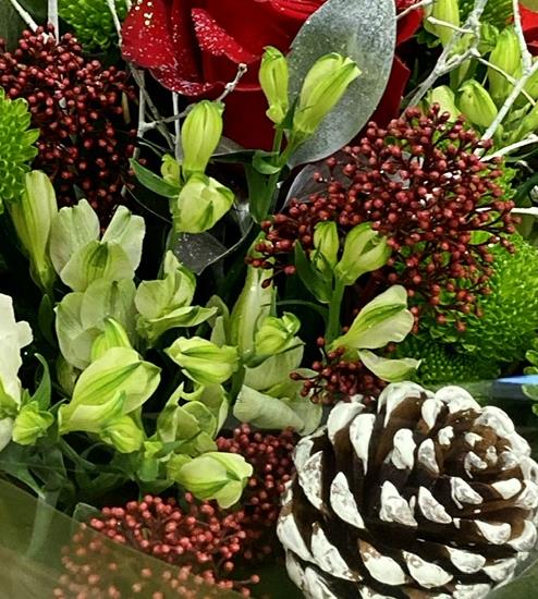 An aqua box of red green and white flowers with white frosted pinecoans , seasonal foliage’s. Red Merry Christmas bow.