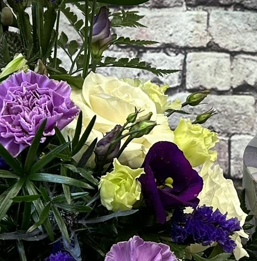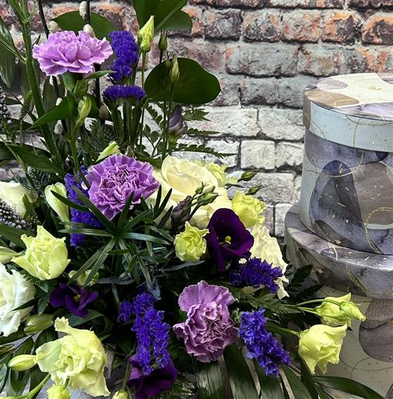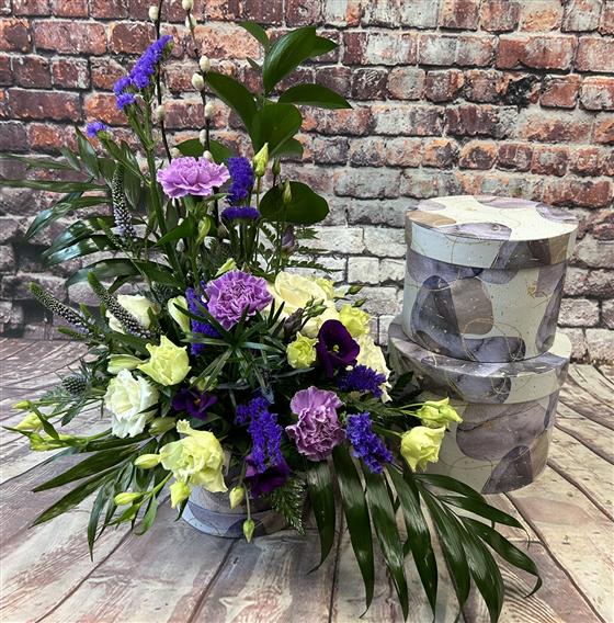A beautiful hat box design in shades of purples, whites and Lilacs. White Roses, purple Carnations, seasonal foliage’s arranged in a matching sustainable box .