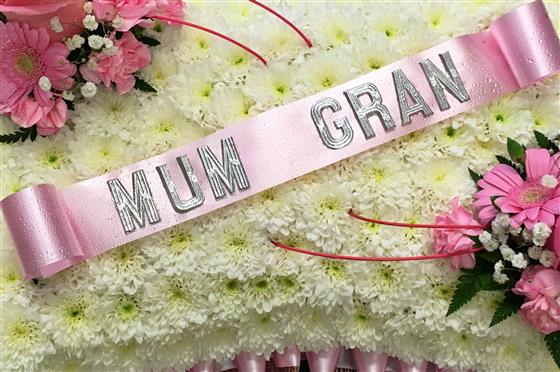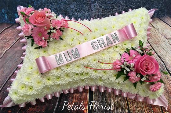 A beautiful 21" pillow based with pale pink ribbon and sprays. Silver letter wording