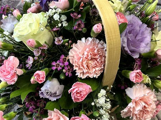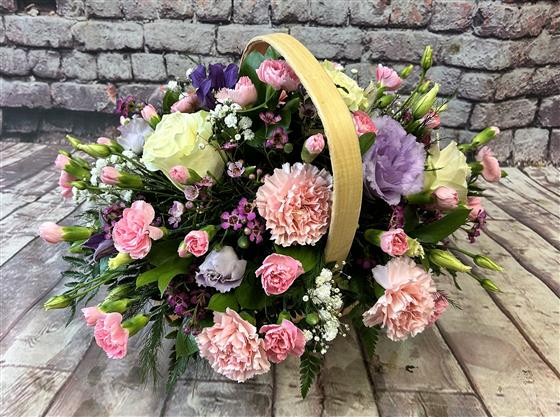 A trug basket with white roses and shades of pink and lilac flowers.