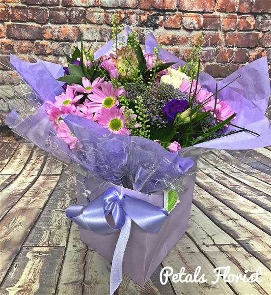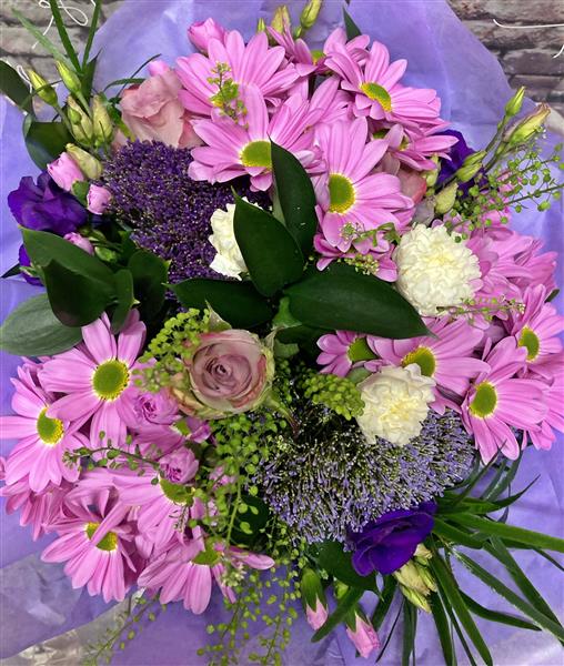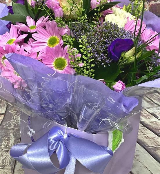 A stunning selection of pink and purple Roses, Freesias, Lisianthus and Carnations. This Luxury Bouquet could be the ideal gift to celebrate Wedding Anniversary or an Engagement but could also be the ultimate romantic gesture to your loved one.