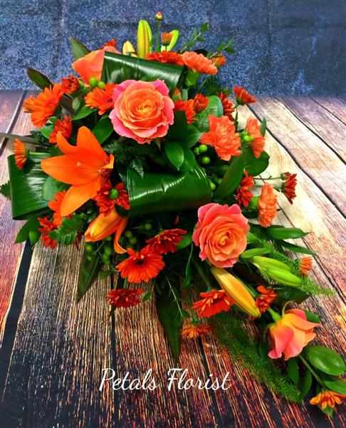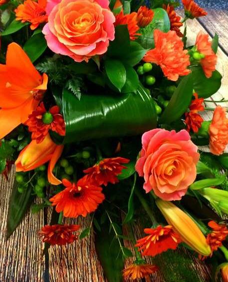A beautiful rich orange tribute of mixed orange flowers with foliage