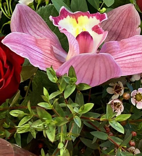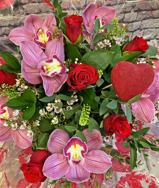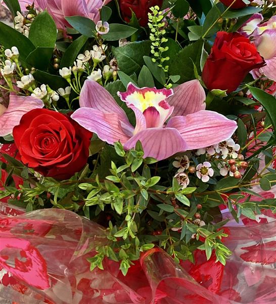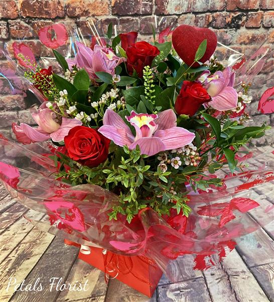 An aqua pack of red roses and beautiful pink Cymbidium orchids and wax flower with seasonal foliage’s. wrapped and delivered in a red box. Velvet heart on a pick.