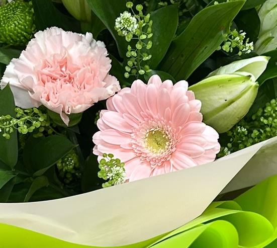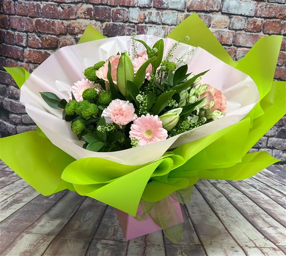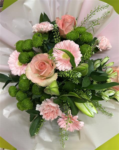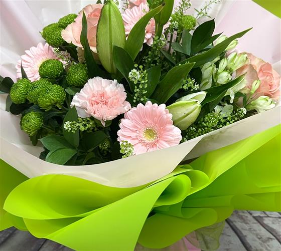 A bright bouquet of vibrant greens and pale pink roses, Gerbera. Seasonal foliage’s ,wrapped and aqua packed.