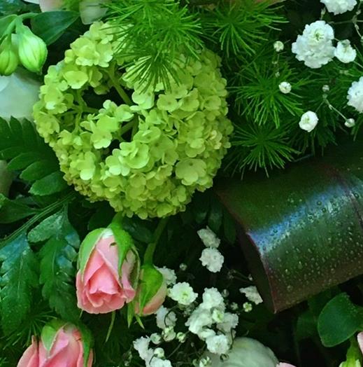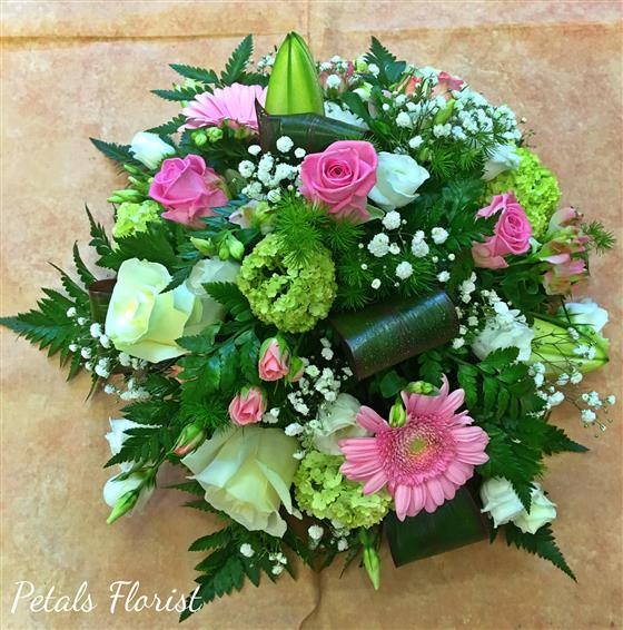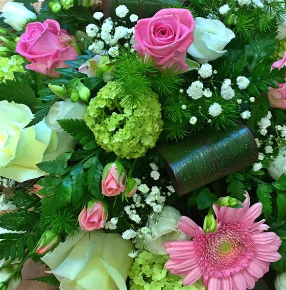 A posy in pale pink flowers and lime green accents. Seasonal foliage’s.