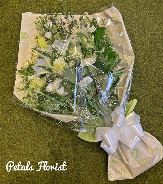 We will personally create your Pure Sympathy Bouquet using the finest white, ivory and cream seasonal flowers.