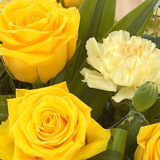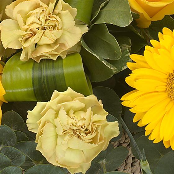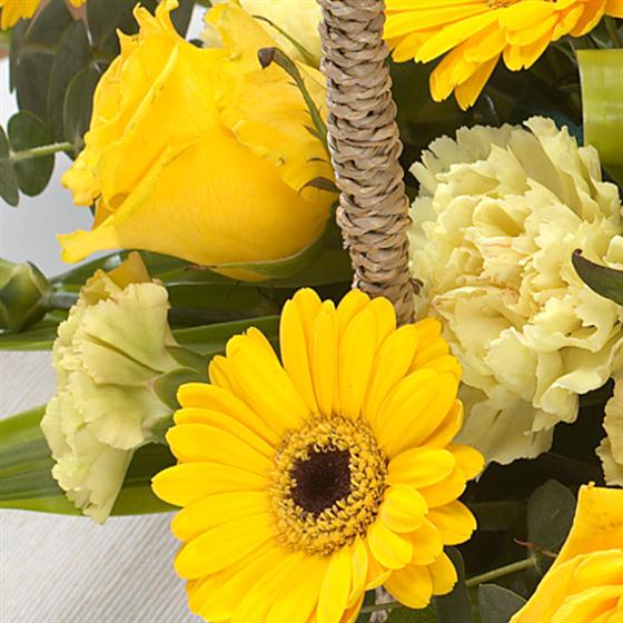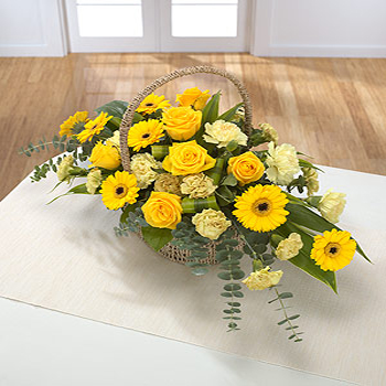 Classic basket arrangement in bright golds: golden Roses and Gerbera fight to outshine the rest of the bunch.