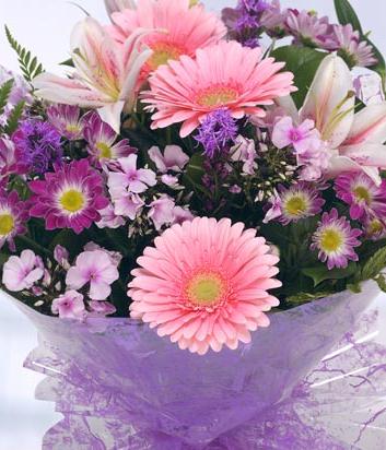 A delightful hand-tied bouquet of mixed flowers in purples and pinks including Gerbera, Lilies, Liatris, Phlox and Chrysanthemums. Beautifully packaged in an aquapack for instant display.