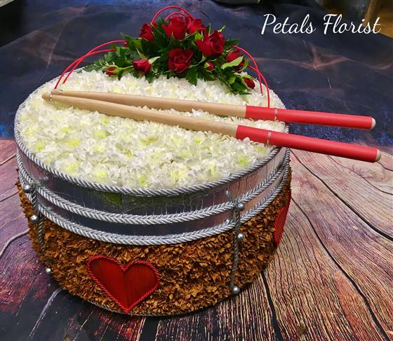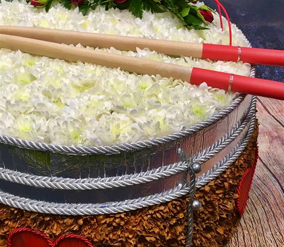 3-d snair drum made from Chrysanth and a matching flower spray. Colour to your choice on drum.