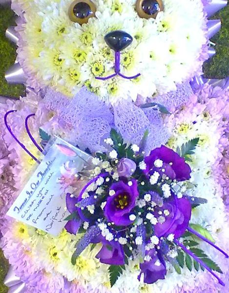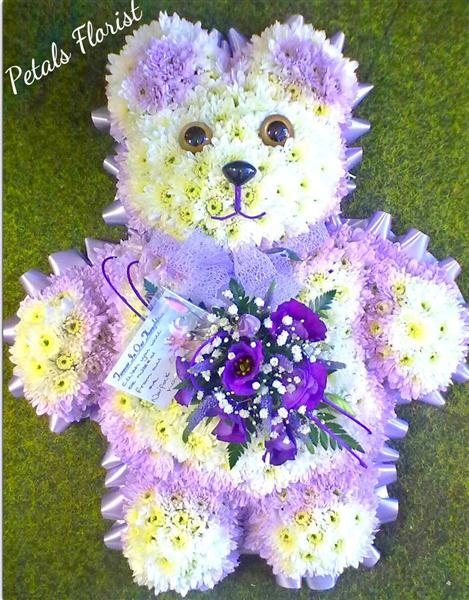 A Teddy tribute for a child,other colours can be made.Made from Chrysanth and matching spray in delicate flowers