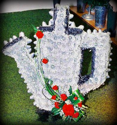 Watering can tribute with rose spray.This tribute is on a stand and upright