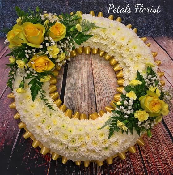 A classic white Chrysanthemum based wreath with yellow roses and foliage.