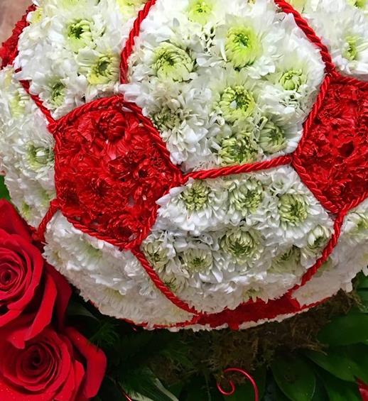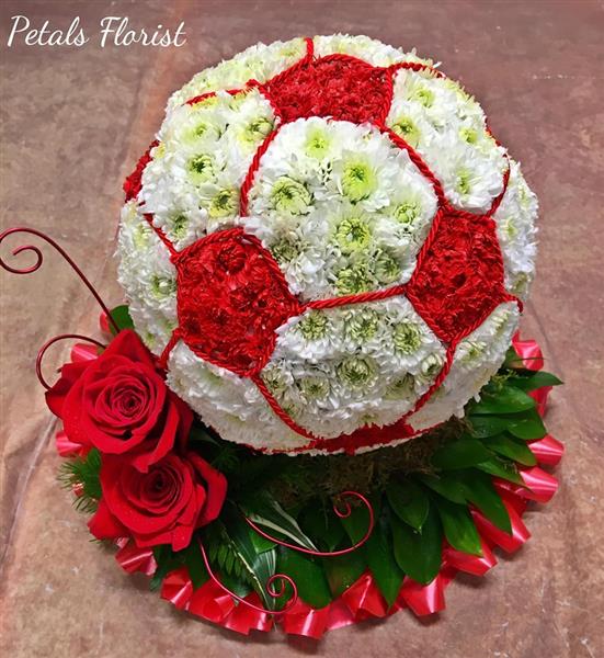 Based Chrysanthemum wreath in the shape of a football on turf. Size: Base - 30cm (12") Height - 33cm (13").