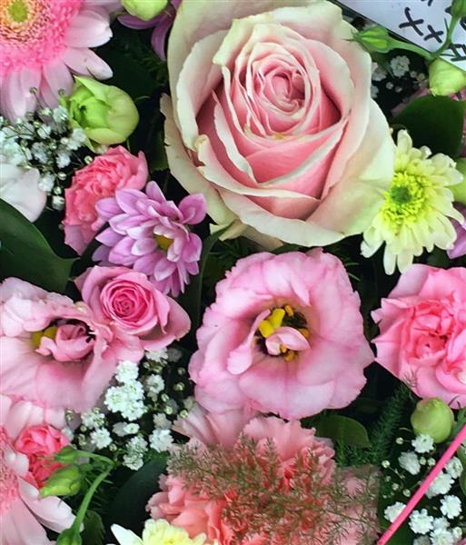 A beautiful pink & white coloured heart shaped tribute, featuring Roses, Eustoma, Chrysanthemums, complementary foliage with a ribbon edge.