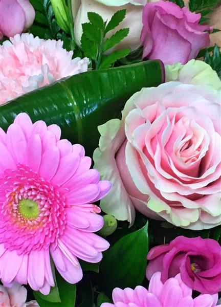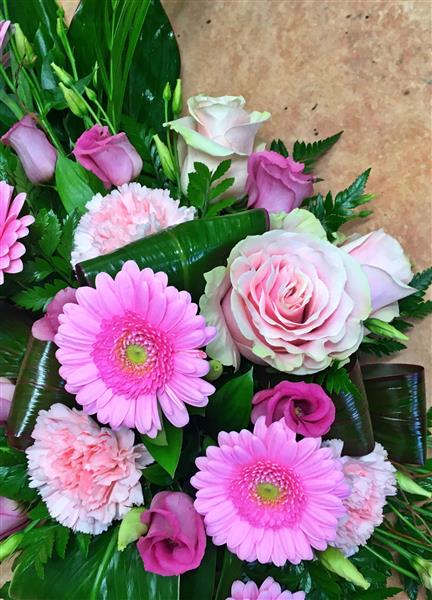 A very pretty pink single ended spray. Roses, Gerbera, Lisianthus and Carnations are lovingly married with Aralia and Aspidistra leaves, Bear Grass .