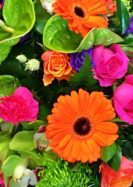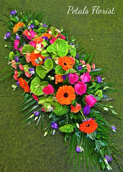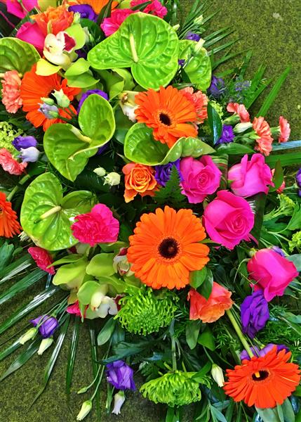 A colourful casket spray. Cerise Roses, green Cymbidium Orchids, Anthuriums, Chrysanthemums and Hypericum with orange Gerbera and Carnations are interspersed with purple Lisianthus beautifully presented on a bed of luscious green foliage.